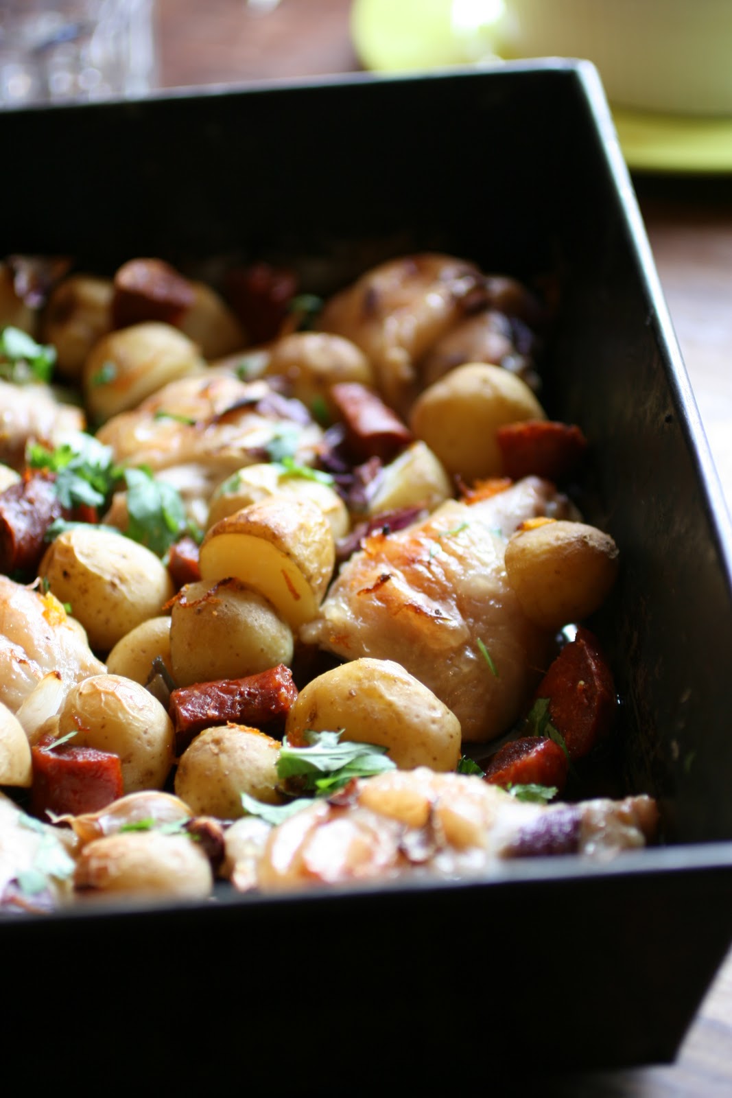 Get 2-3 chicken thighs for each person eating, 1 or 2 big U-shaped Chorizo sausages, and some baby new potatoes (I guess allow 7-8 per person, depending how big your potatoes and portions are).