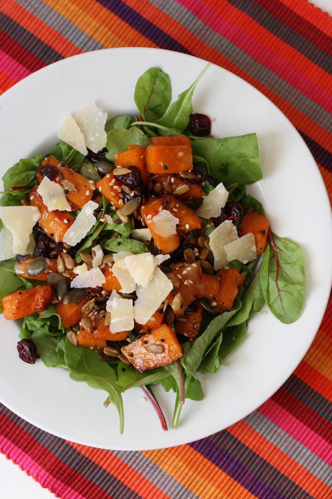 On a plate or bowl, place the butternut squash and cranberries over the salad. Sprinkle with the seeds and the parmesan shards. Drizzle over the dressing and serve!